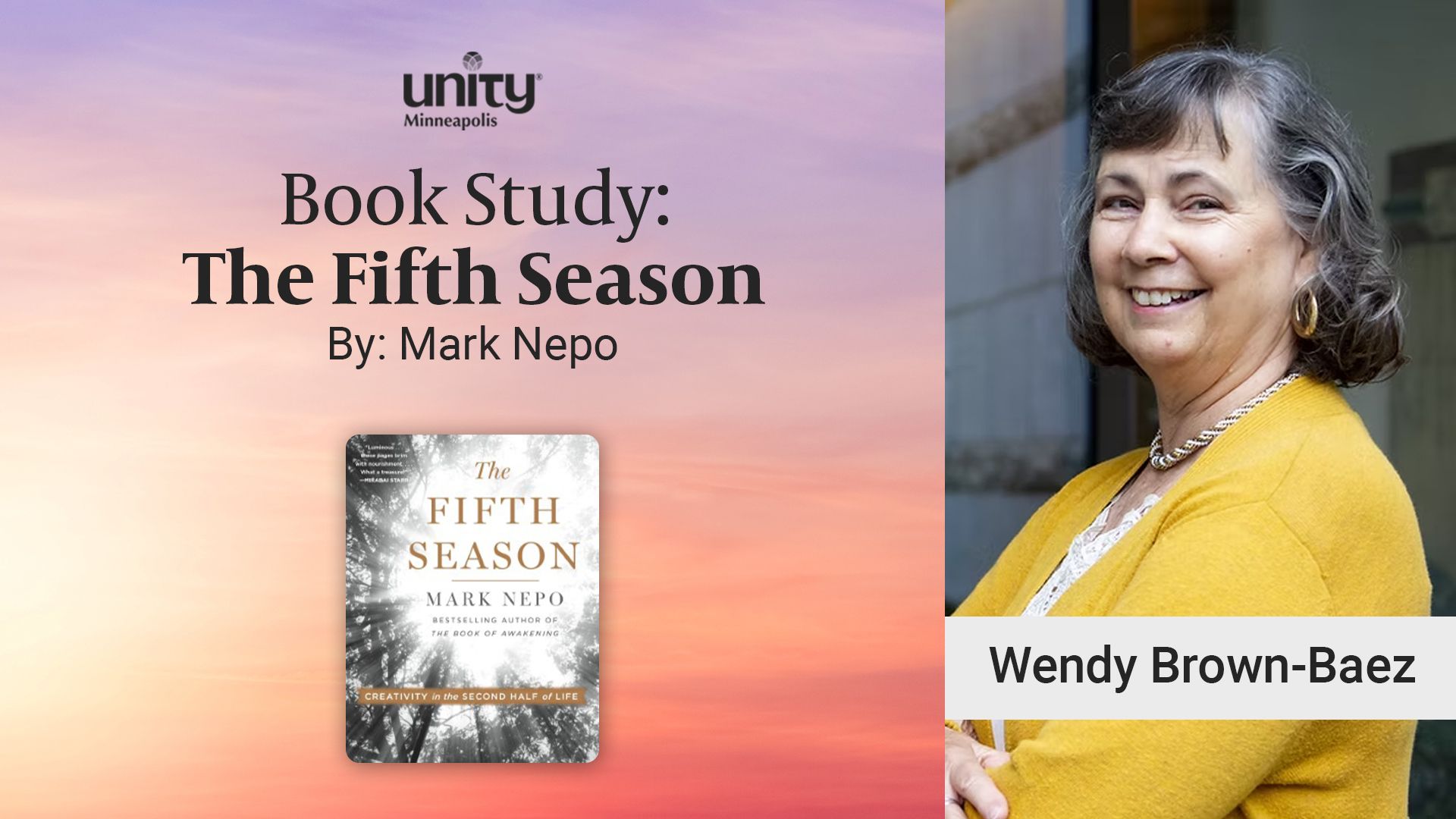 Join Wendy Brown-Baez for an exploration of The Fifth Season by Mark Nepo. This book offers Mark’s wise and gentle insights on growing older, helping readers identify the second half of life as a turning point, a time of integration and transformation that guides us in making sense of our experiences. Beloved as a poet, teacher, and storyteller, Mark has been called “one of the finest spiritual guides of our time,” “a consummate storyteller,” and “an eloquent spiritual teacher.”